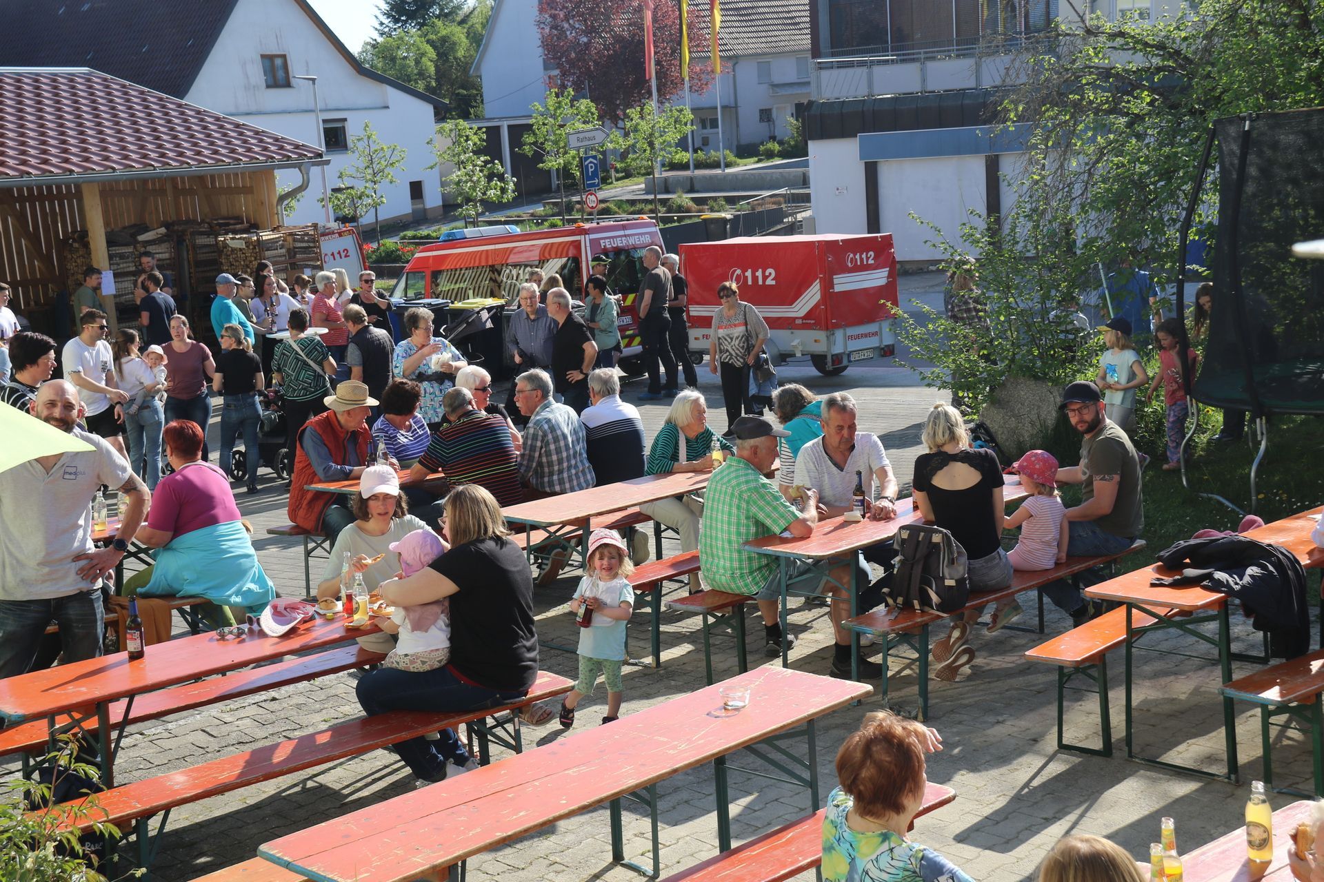 und Bürger verfolgten mit ihren Kindern aus sicherer Entfernung das „Maibaumstellen“.