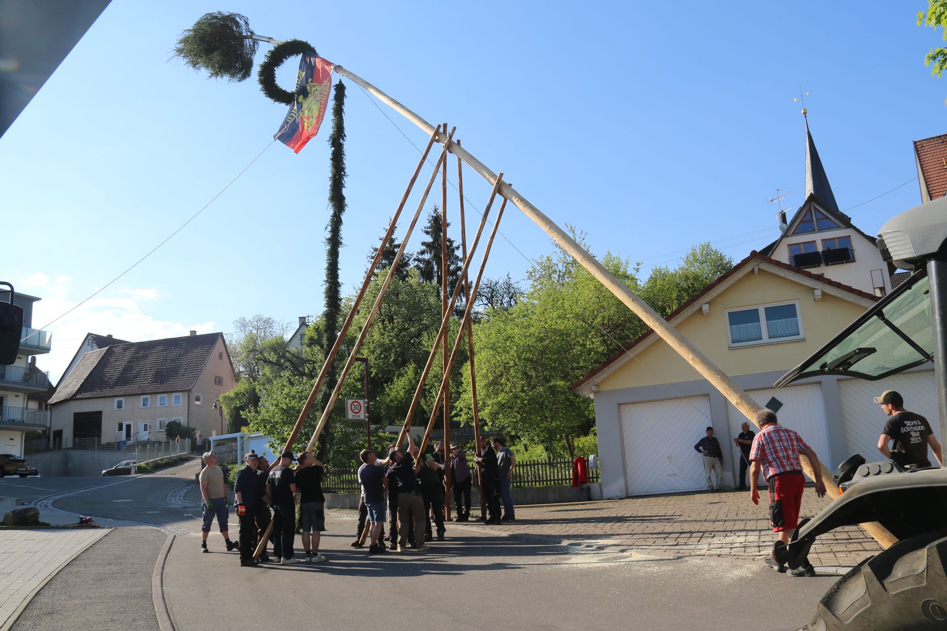 aufgestellt. Der über zwanzig Meter hohe und geschmückte Maibaum wurde mit Muskelkraft