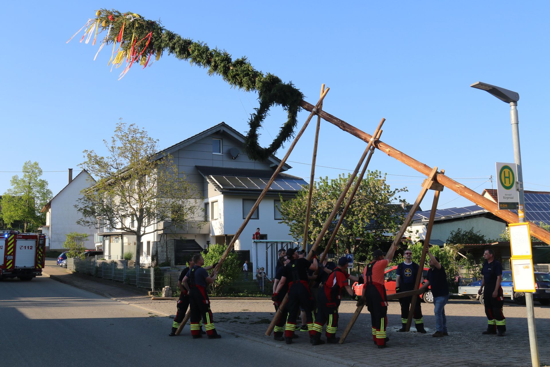 Die Freiwillige Feuerwehr Abteilung Worndorf hat vor dem Bürgersaal den Maibaum